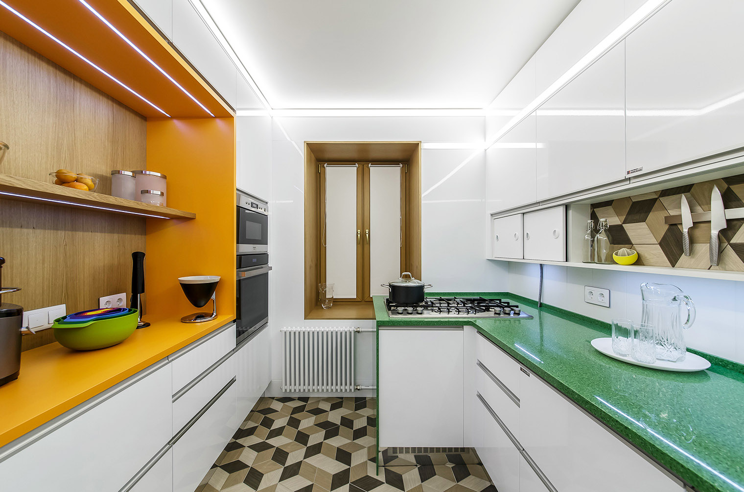 Конструктивно угловая кухня предполагает две линейные стороны и угловую часть, но может весьма органично сочетаться с островом и барной стойкой. Конечно, это вариант для просторных помещений или квартир-студий, но зато он смотрится очень эффектно. При выборе гарнитура важно учитывать также удобство расположения мойки, холодильника и плиты. Мы разрабатываем угловые кухни с учетом требований эргономики и безопасности, но эти рамки достаточно широки, чтобы можно было подобрать что-то, подходящее под индивидуальные требования.