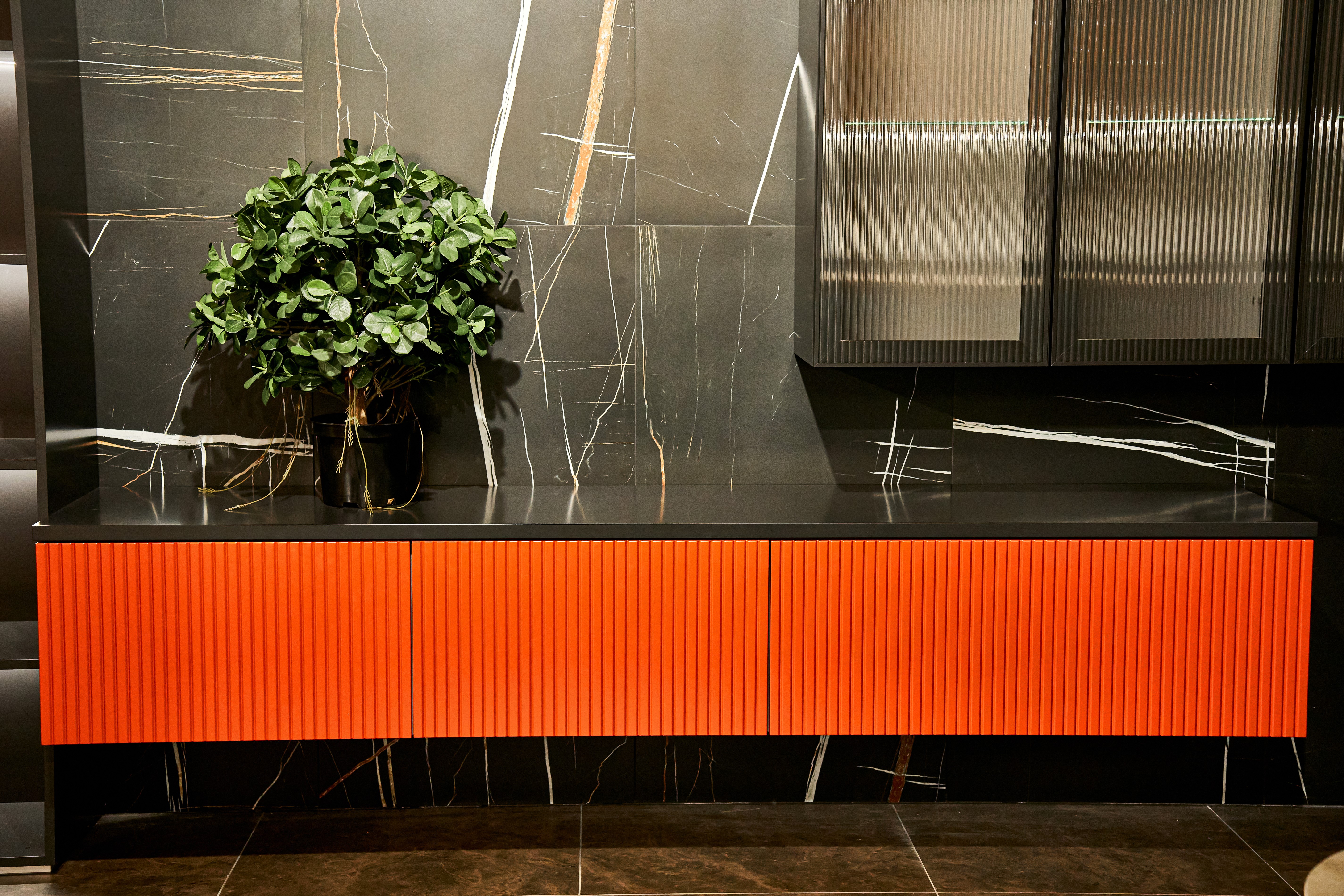 Комплект мебели для гостиной включает подвесную тумбу для ТВ с двумя откидными фасадами и топом.