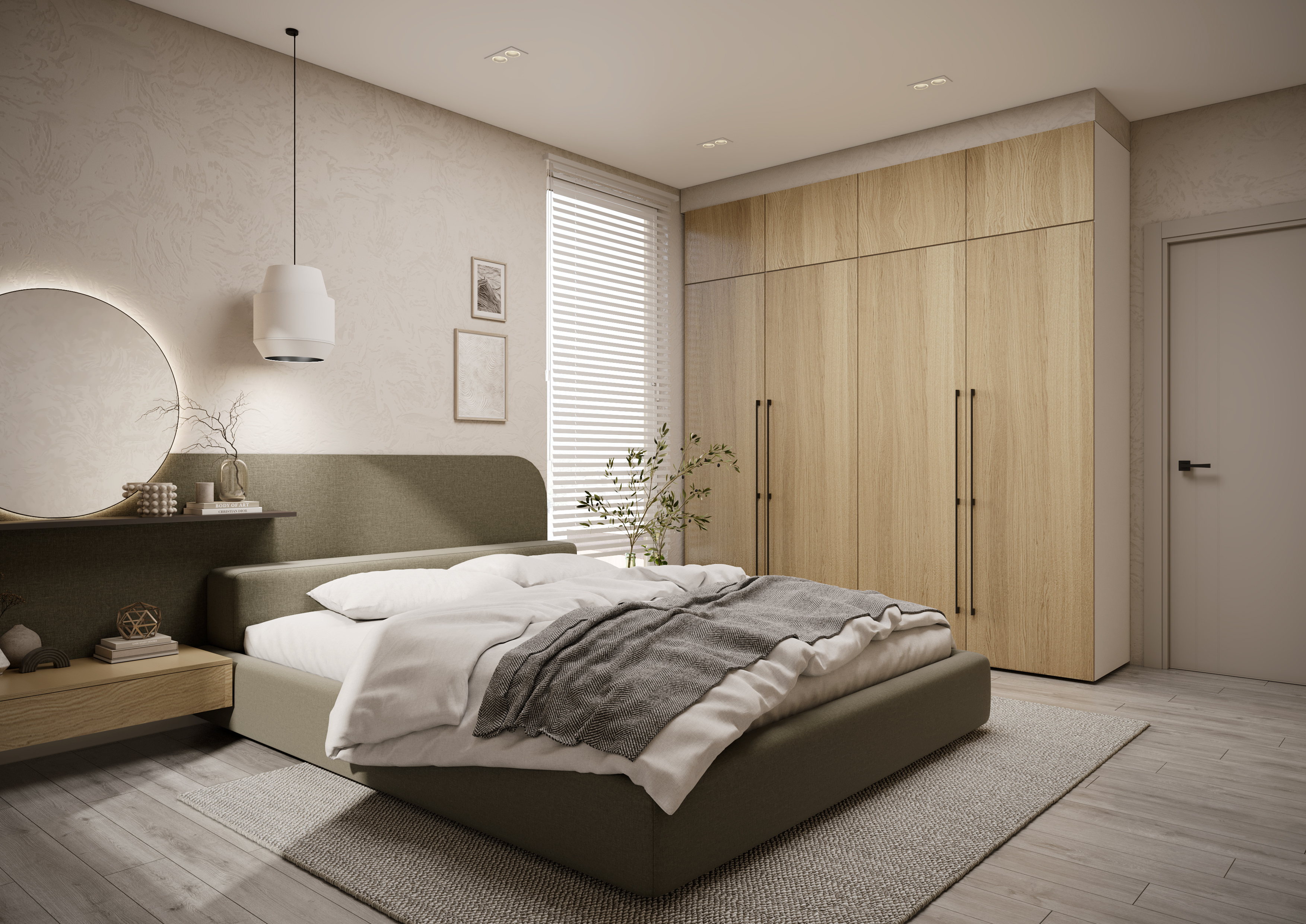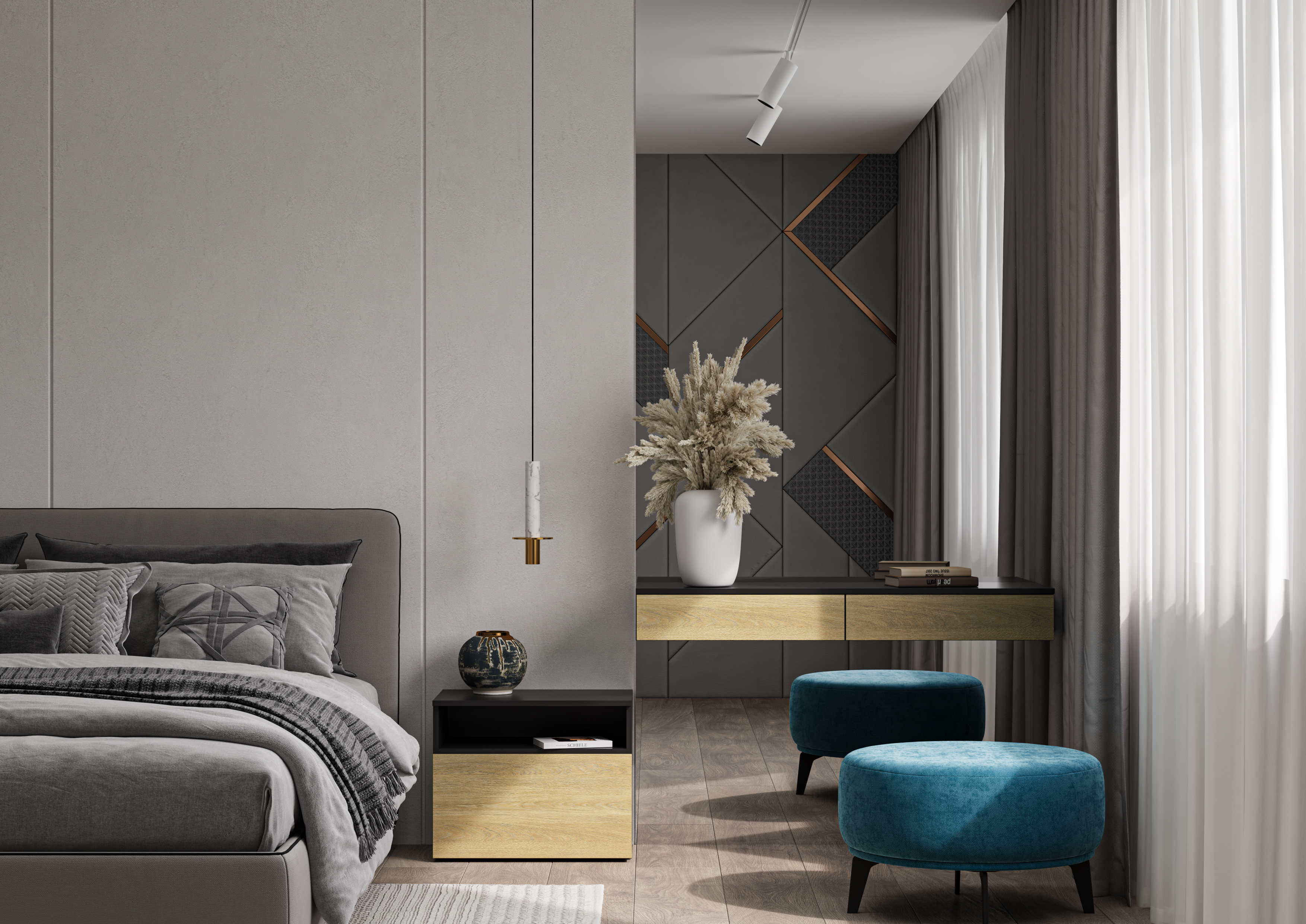 Комплект мебели для спальни включает подвесную прикроватную тумбу с выдвижным ящиком, большой комод и подвесной ящик-консоль, объединенный с комодом общим топом и выполняющий функции туалетного столика.