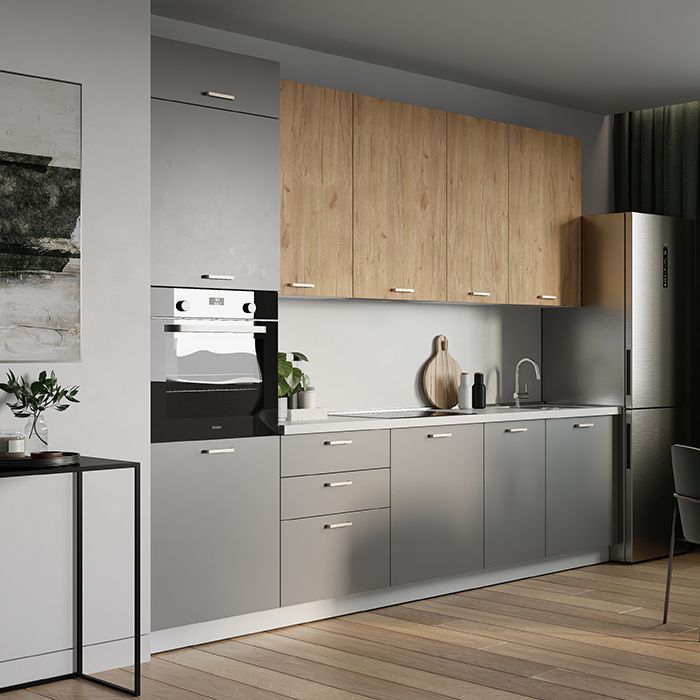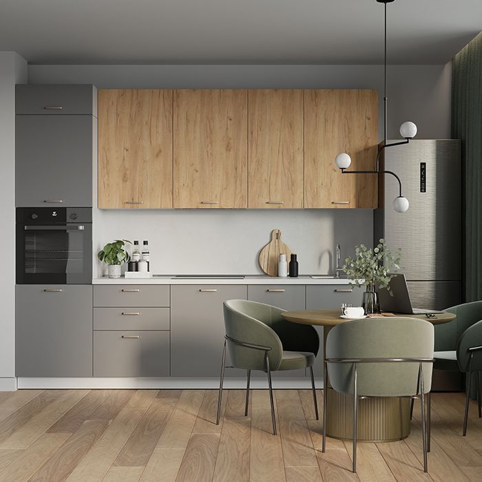 Дымчато-серая кухня с акцентными фасадами в древесном декоре и светлой столешницей с фактурой камня. Высокие навесные шкафы имеют по три полки. Модуль для размещения над мойкой укомплектован сушилкой для посуды, модуль с выдвижными ящиками - лотком для столовых приборов. В колонну встраивается духовой шкаф. Предусмотрено место для встраиваемой посудомоечной машины шириной 45 см. Добавьте декора для домашнего уюта, и ваша кухня будет великолепна!